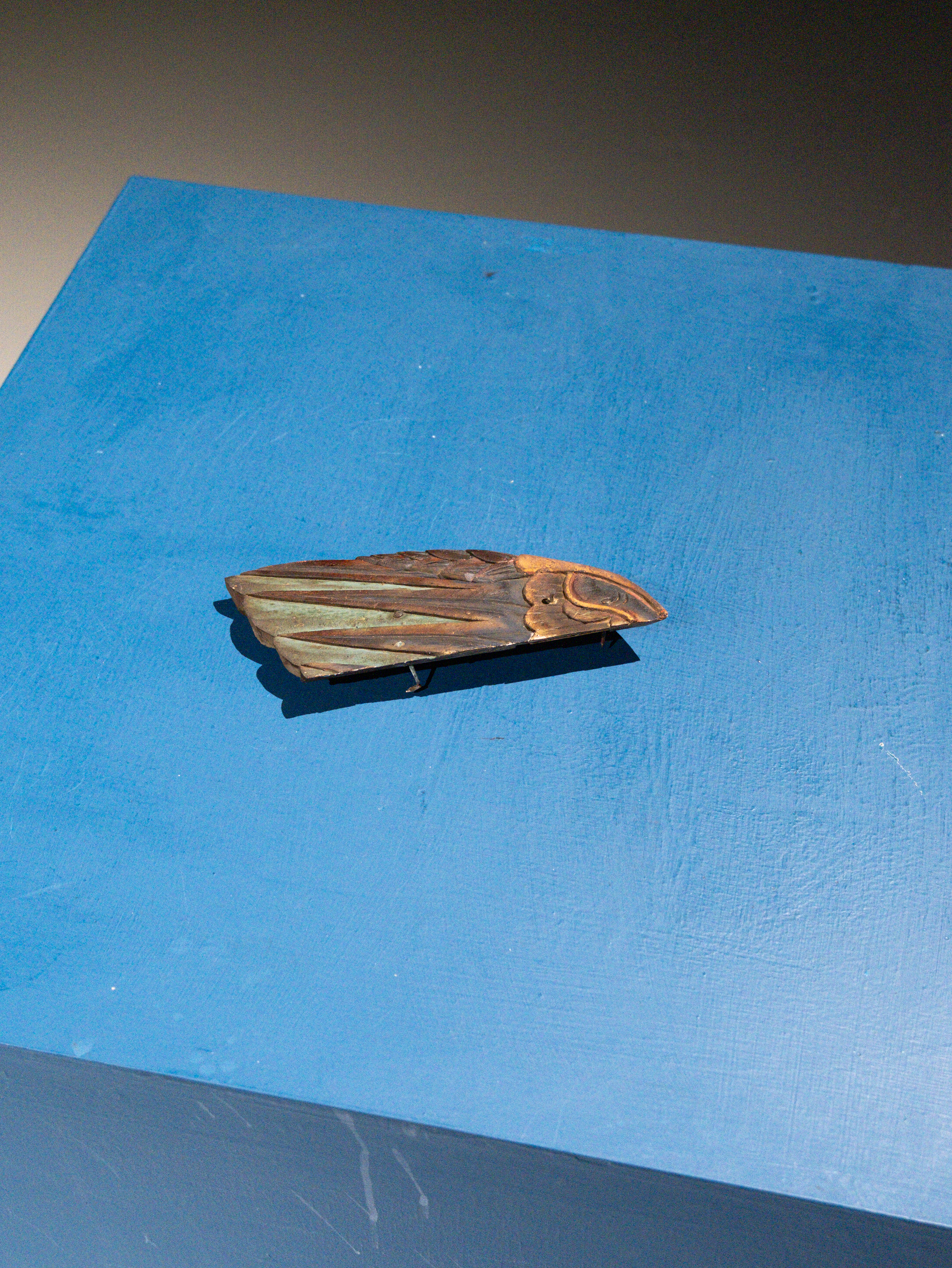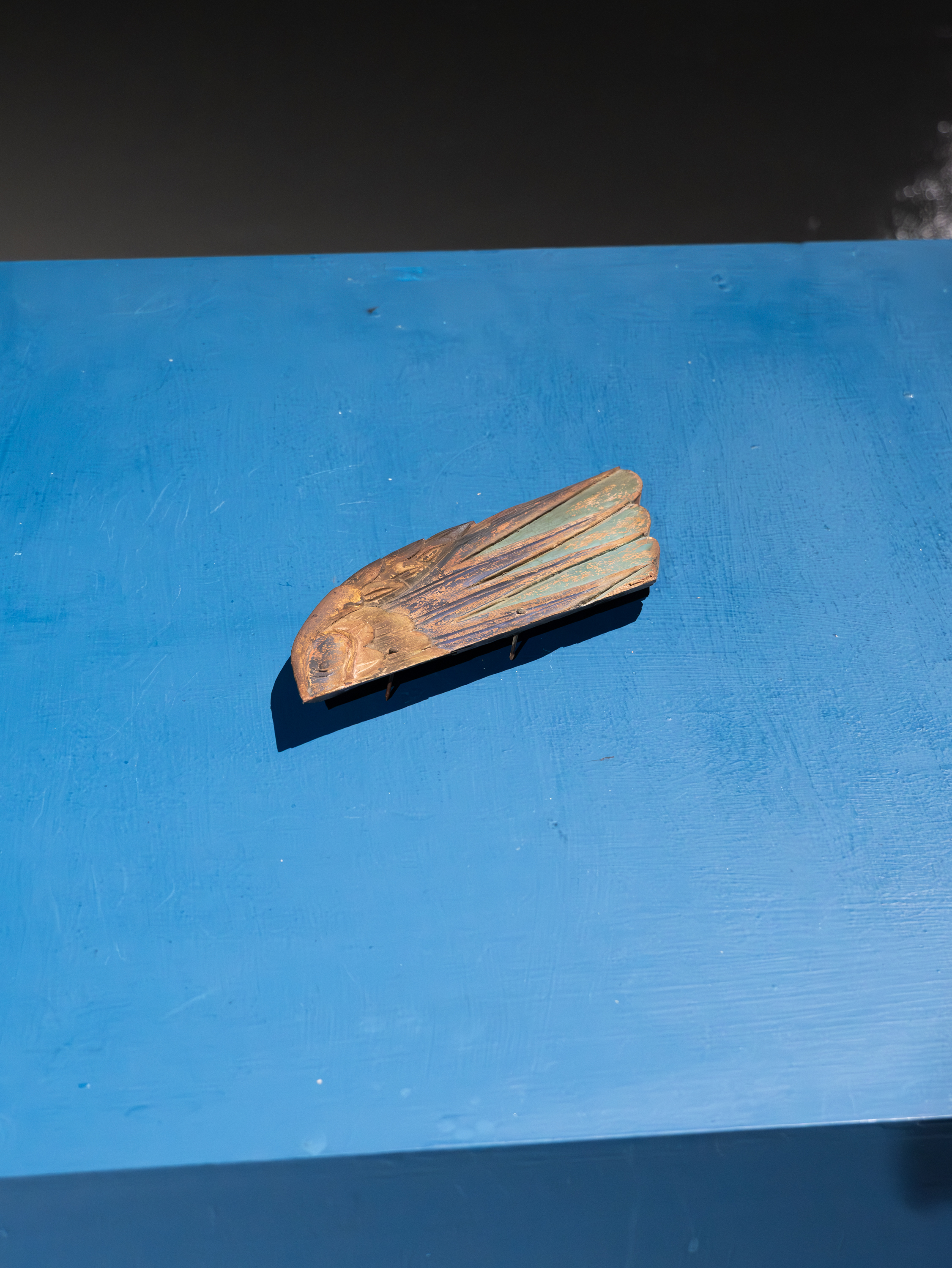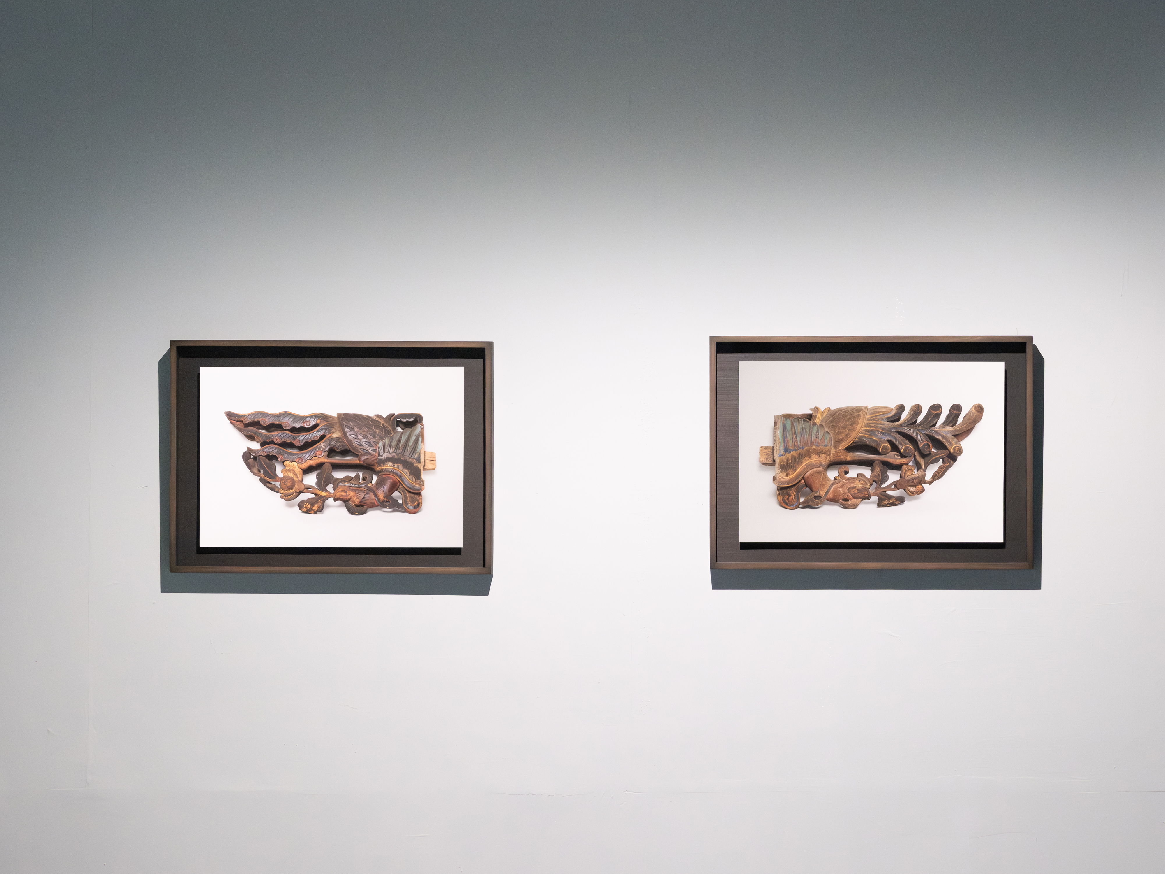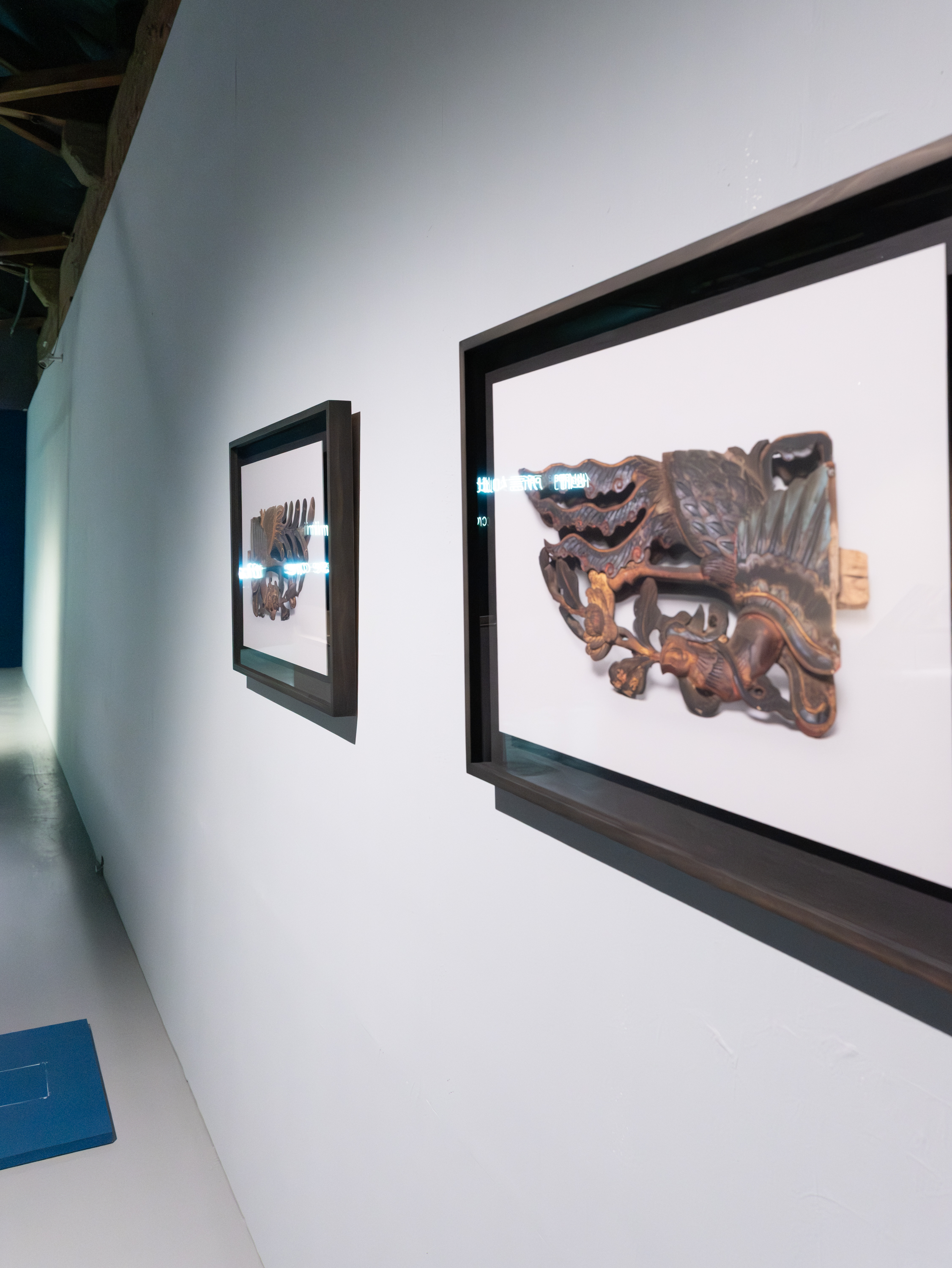 Two weathered wooden carvings of wings present as poetic remnants of architectural heritage. Preserved from demolished historical buildings in Taiwan, these ornamental fragments were once integral to traditional house decorations. Now divorced from their original context, they are re-examined through photographic documentation and presentation on blue panels.