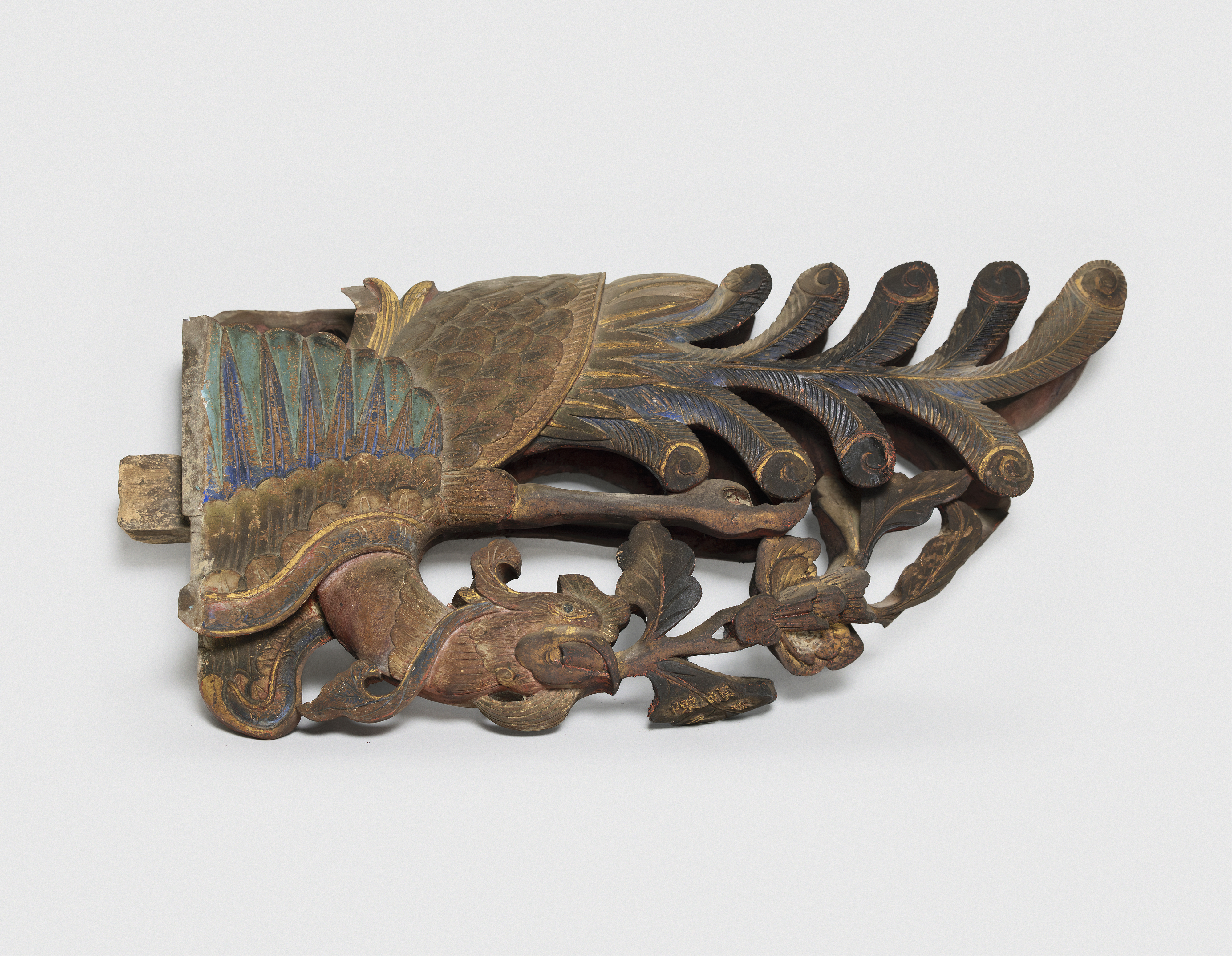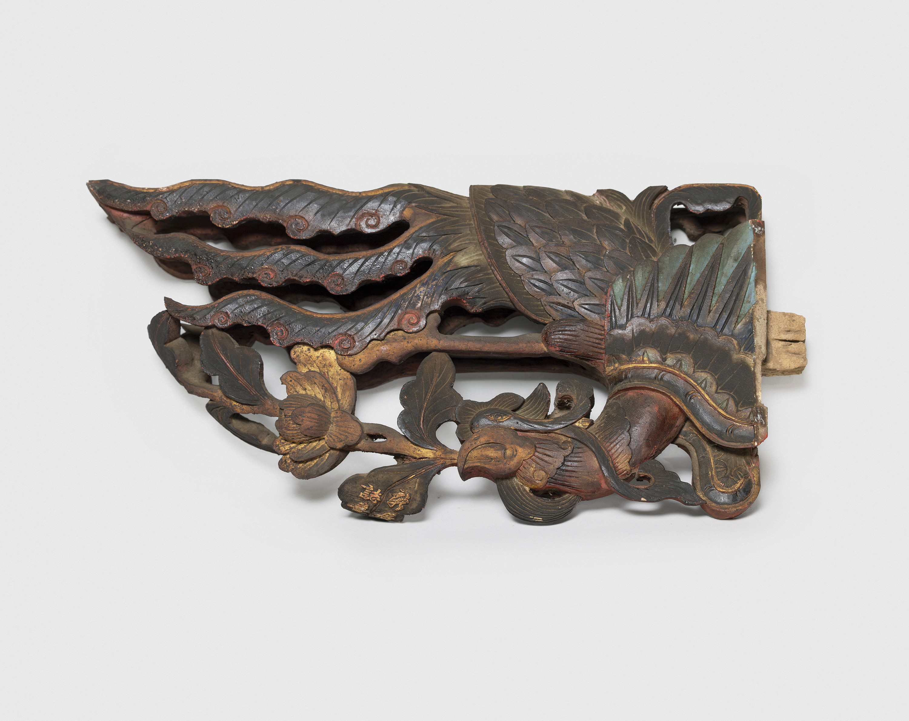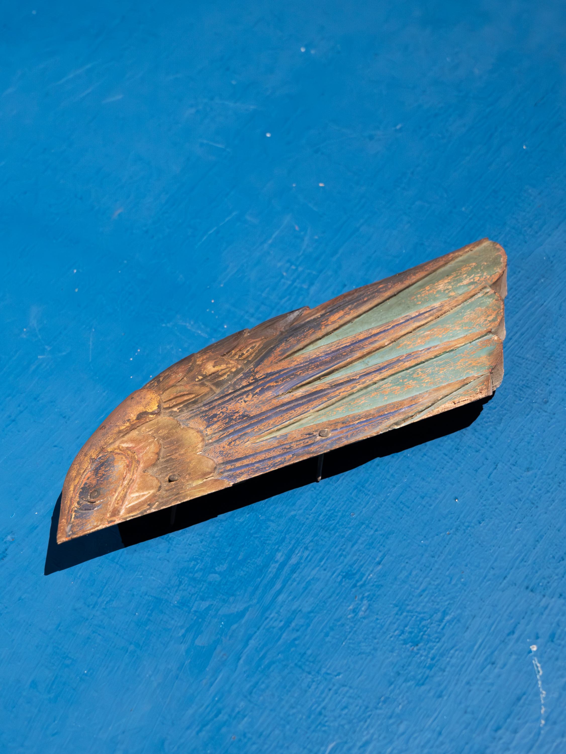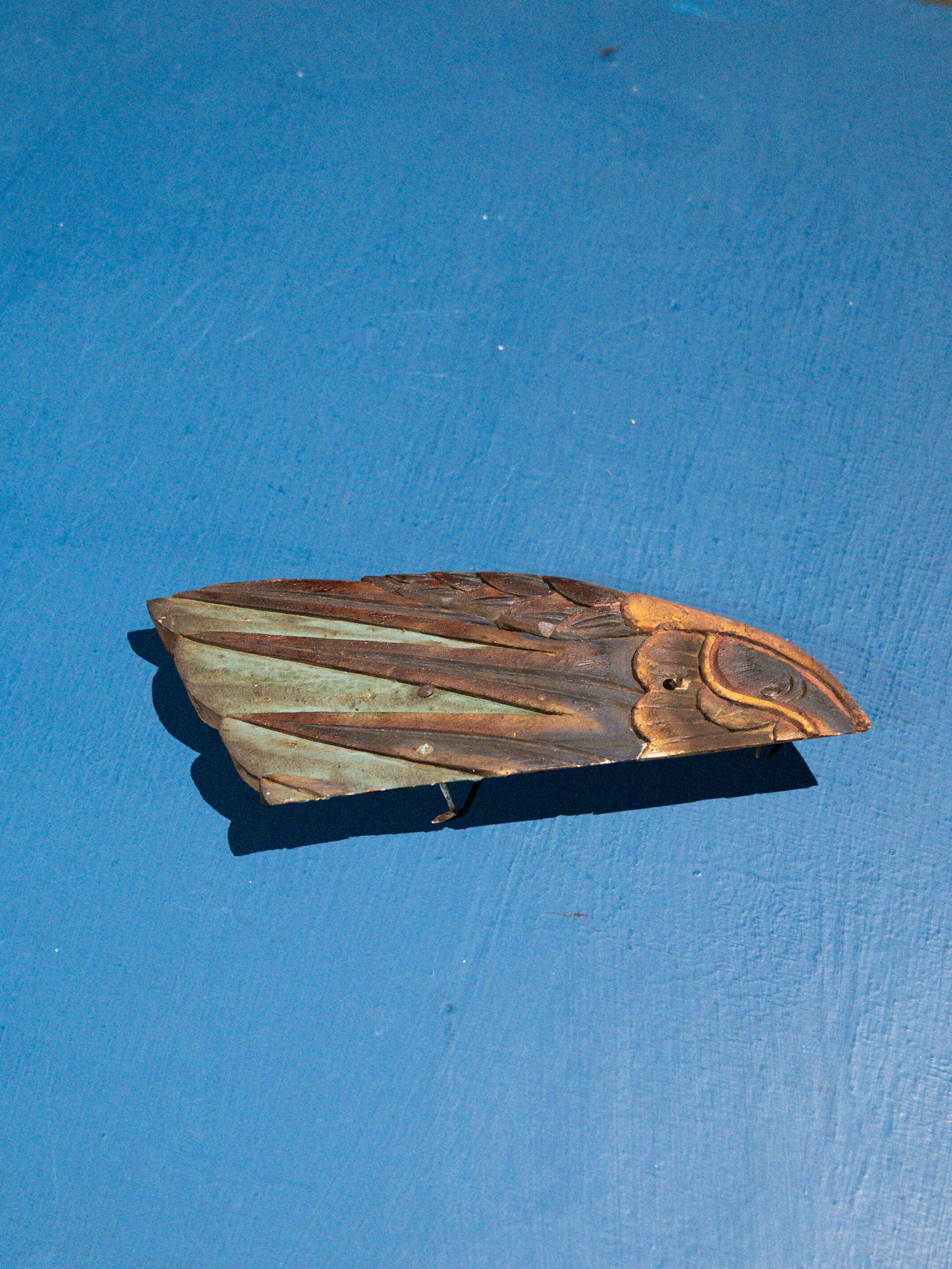 Two weathered wooden carvings of wings present as poetic remnants of architectural heritage. Preserved from demolished historical buildings in Taiwan, these ornamental fragments were once integral to traditional house decorations. Now divorced from their original context, they are re-examined through photographic documentation and presentation on blue panels.