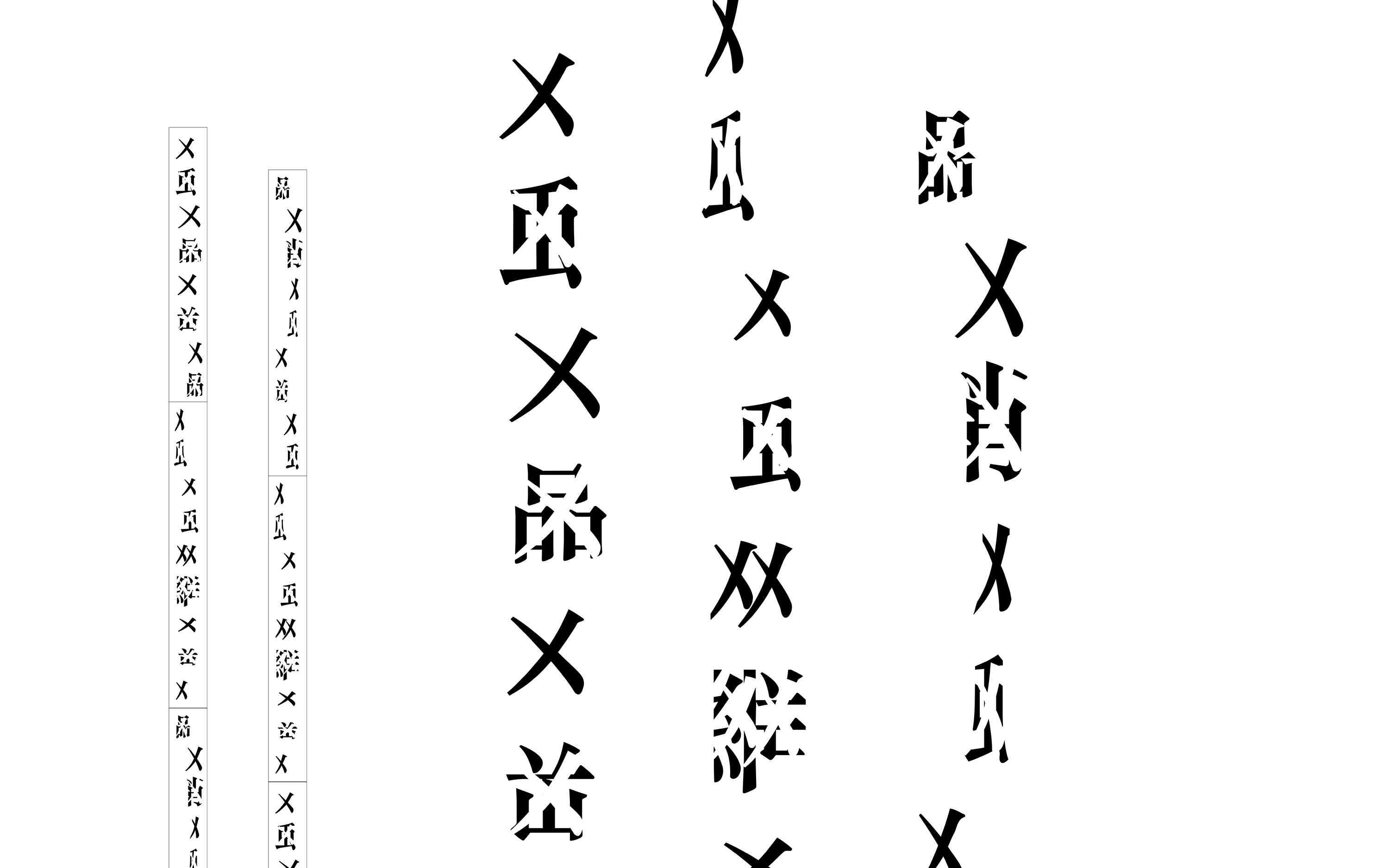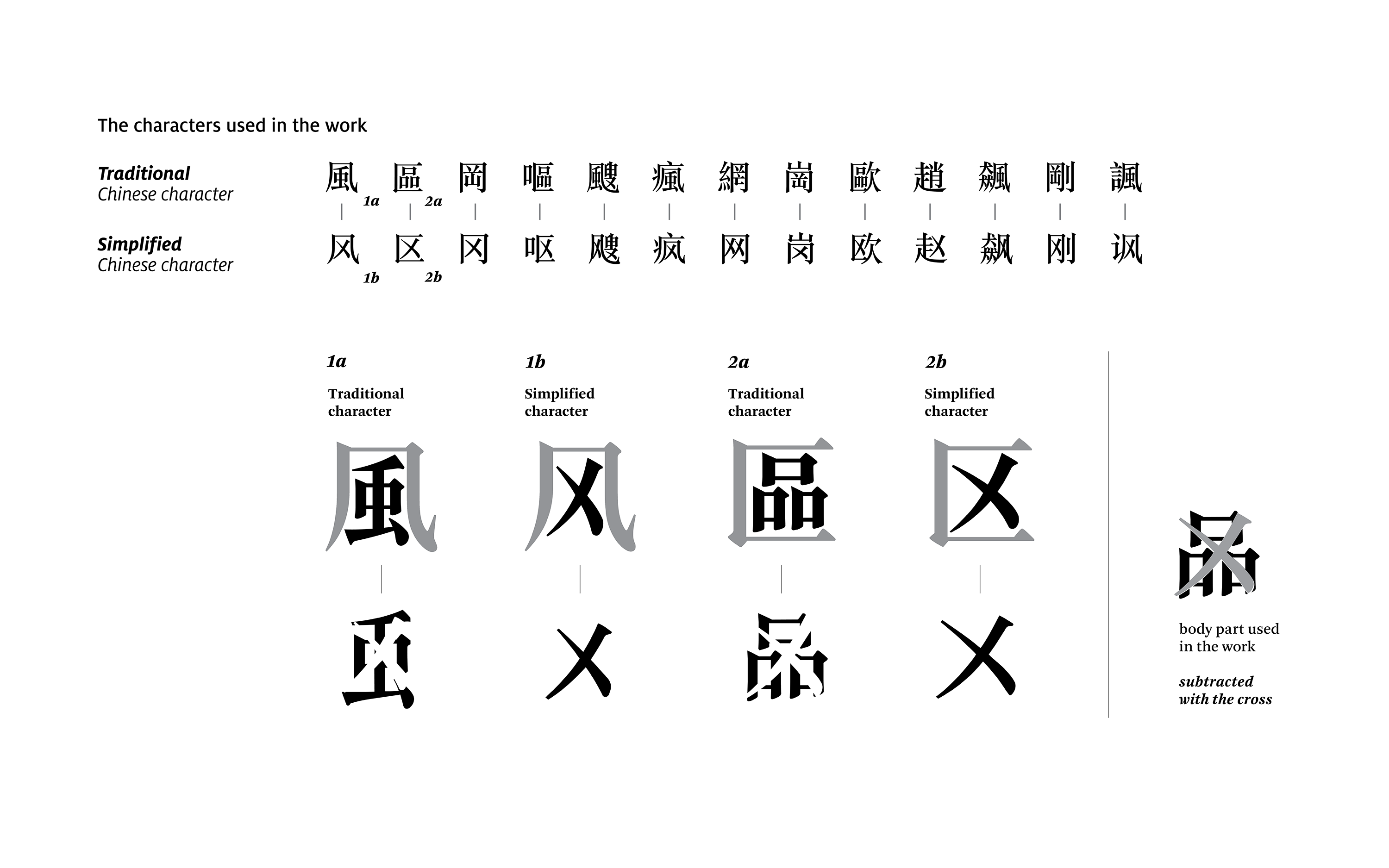 The work examines a set of simplified Chinese characters where certain elements were replaced by crosses, an universal marks of negation.